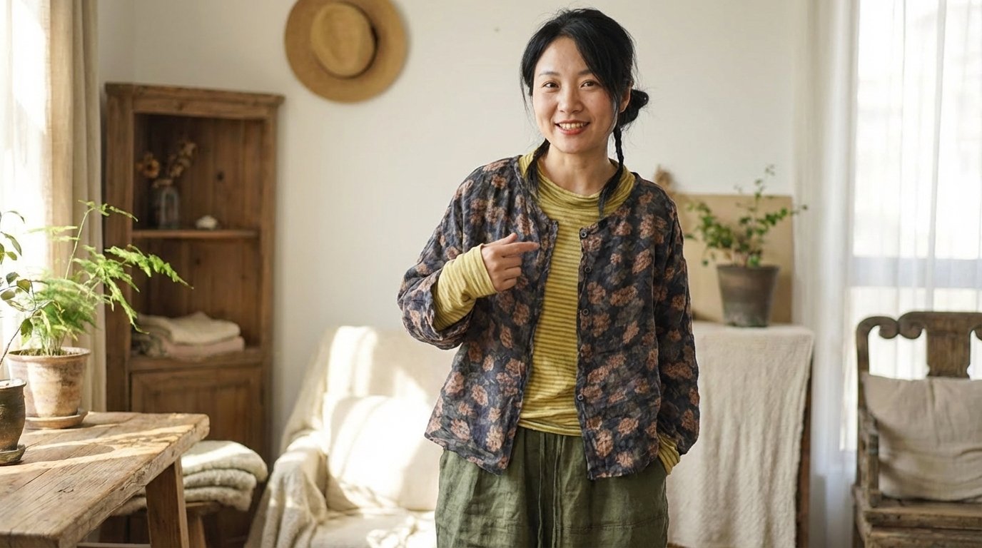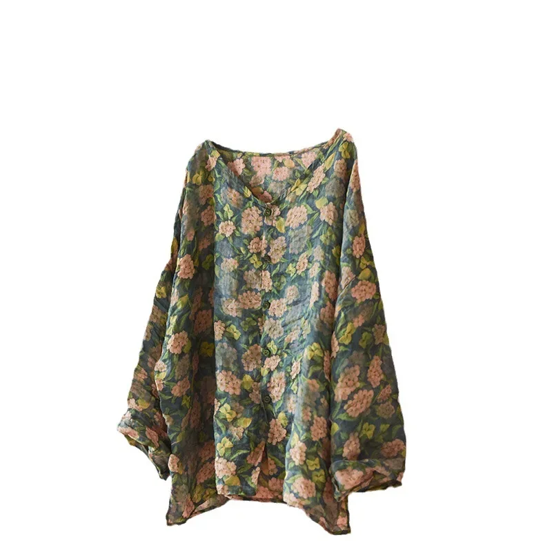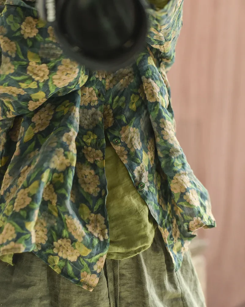 🌿 Design Inspiration: The Breath of Nature This garment is a tribute to the ancient art of “Ramie” (China Grass) weaving, one of the oldest and most durable natural fibers in the world. Inspired by the “Slow Fashion” movement and the serene beauty of a secret garden, this blouse captures the essence of organic living. The vintage botanical prints are not just patterns; they look like watercolor paintings drifting across a textured canvas. It is designed for the woman who finds luxury in breathability and elegance in the raw, unrefined beauty of nature.