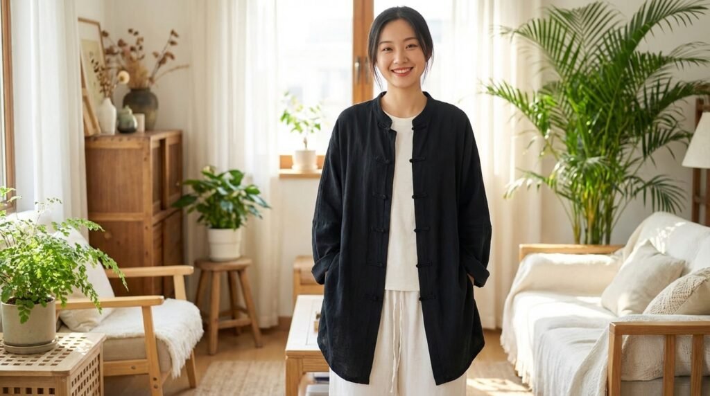โชโซ Design Inspiration: The Balance of Yin & Yang This garment is a sartorial expression of “Zen” philosophyโfinding richness in simplicity. Inspired by the stark, beautiful contrast of traditional calligraphy ink on rice paper, this shirt embodies the concept of “Ma” (negative space). It rejects the constraints of tight tailoring in favor of a free-flowing, oversized silhouette that allows the body to breathe and move without restriction. It is a fusion of Chinese heritage (the Mandarin collar) and Japanese minimalism, designed for the woman who values inner peace and outer elegance.